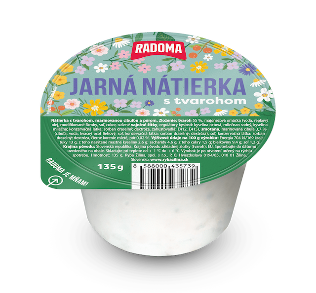 Tvaroh 55 %, majonézová omáčka (voda, repkový olej, modifikované škroby, soľ, cukor, sušené vaječné žĺtky, regulátory kyslosti: kyselina octová, mliečnan sodný, kyselina mliečna; konzervačná látka: sorban draselný; dextróza, zahusťovadlá: E412, E415), smotana, marinovaná cibuľa 3,7 % (cibuľa, voda, kvasný ocot liehový, soľ, konzervačná látka: sorban draselný; dextróza), soľ, konzervačná látka: sorban draselný; dextróza, čierne korenie mleté, pór 0,02%