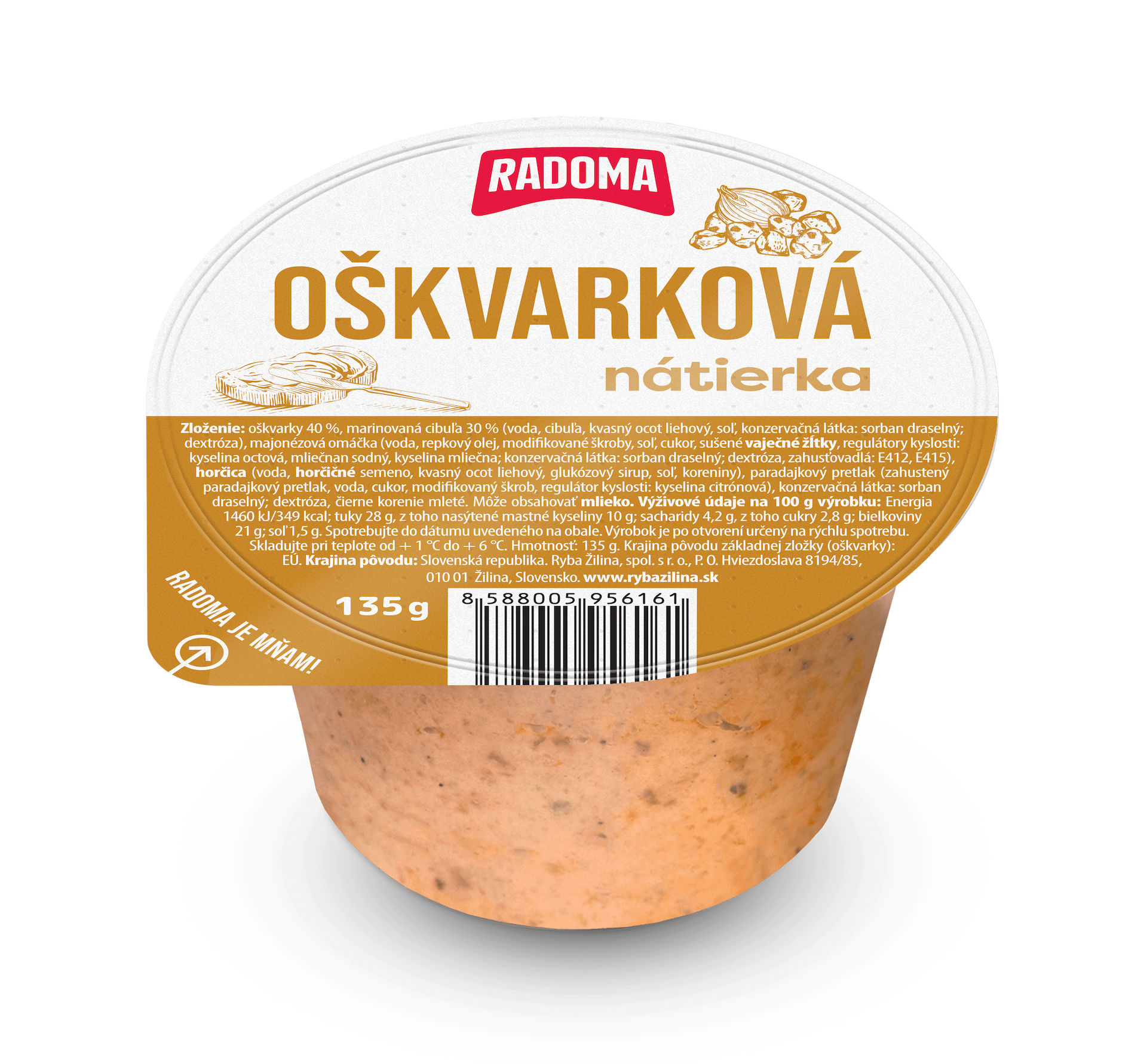 Oškvarky 42%, marinovaná cibuľa 33% (pitná voda, cibuľa, kvasný ocot liehový, jedlá soľ, konzervačná látka: sorban draselný; dextróza), majonézová omáčka (pitná voda, repkový olej, zahusťovadlá: E412, E415; jedlá soľ, cukor, modifikované škroby, sušené vaječné žĺtky, regulátory kyslosti: kyselina octová, mliečnan sodný, kyselina mliečna; konzervačná látka: sorban draselný; dextróza), horčica (pitná voda, horčičné semeno, kvasný ocot liehový, glukózový sirup, jedlá soľ, koreniny), paradajkový pretlak (zahustený paradajkový pretlak, pitná voda, cukor, modifikovaný škrob, regulátor kyslosti: kyselina citrónová), konzervačná látka: sorban draselný; dextróza, čierne korenie mleté.